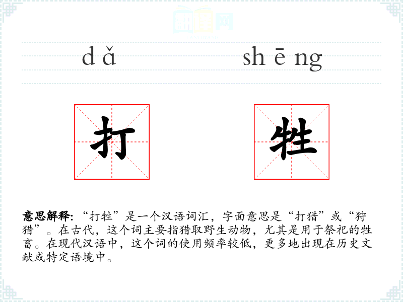 “打牲”是一个汉语词汇,字面意思是“打猎”或“狩猎”。在古代,这个词主要指猎取野生动物,尤其是用于祭祀的牲畜。在现代汉语中,这个词的使用频率较低,更多地出现在历史文献或特定语境中。