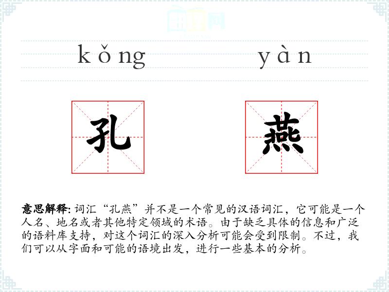 词汇“孔燕”并不是一个常见的汉语词汇,它可能是一个人名、地名或者其他特定领域的术语。由于缺乏具体的信息和广泛的语料库支持,对这个词汇的深入分析可能会受到限制。不过,我们可以从字面和可能的语境出发,进行一些基本的分析。