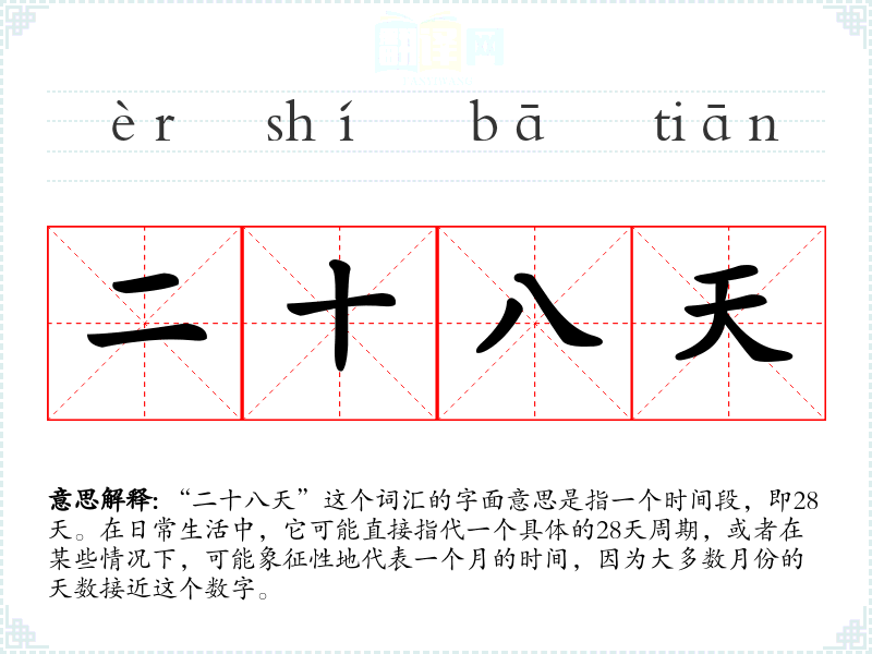 “二十八天”这个词汇的字面意思是指一个时间段,即28天。在日常生活中,它可能直接指代一个具体的28天周期,或者在某些情况下,可能象征性地代表一个月的时间,因为大多数月份的天数接近这个数字。