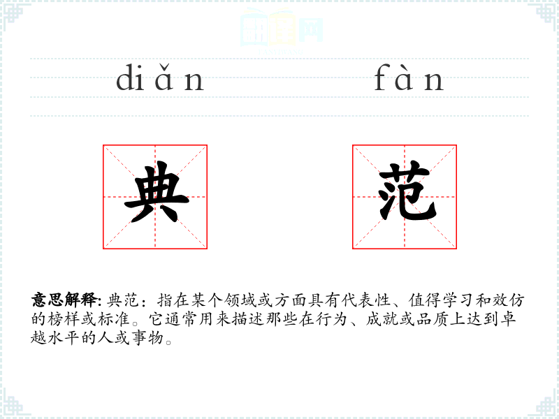 - 对应词汇:在英语中,“exemplar”和“paragon”可以对应中文的“典范”。