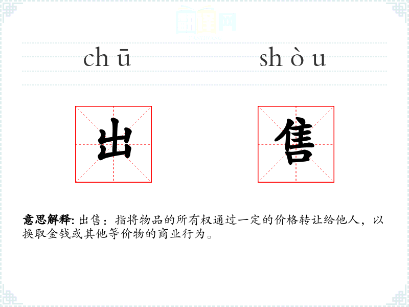 出售:指将物品的所有权通过一定的价格转让给他人,以换取金钱或其他等价物的商业行为。