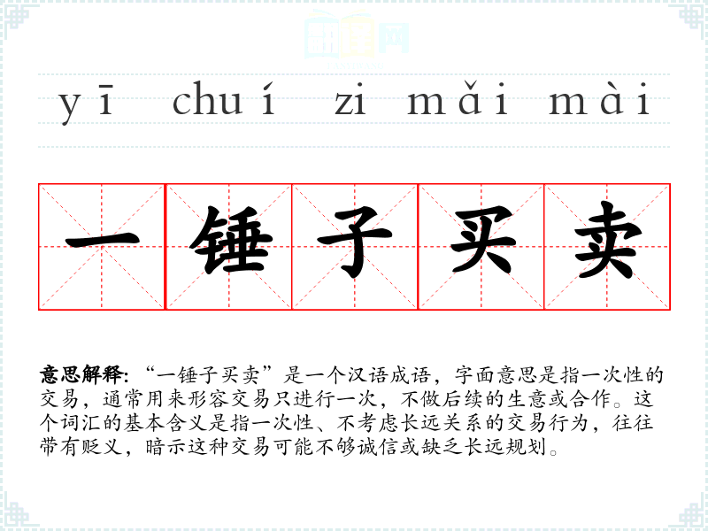 “一锤子买卖”是一个汉语成语,字面意思是指一次性的交易,通常用来形容交易只进行一次,不做后续的生意或合作。这个词汇的基本含义是指一次性、不考虑长远关系的交易行为,往往带有贬义,暗示这种交易可能不够诚信或缺乏长远规划。