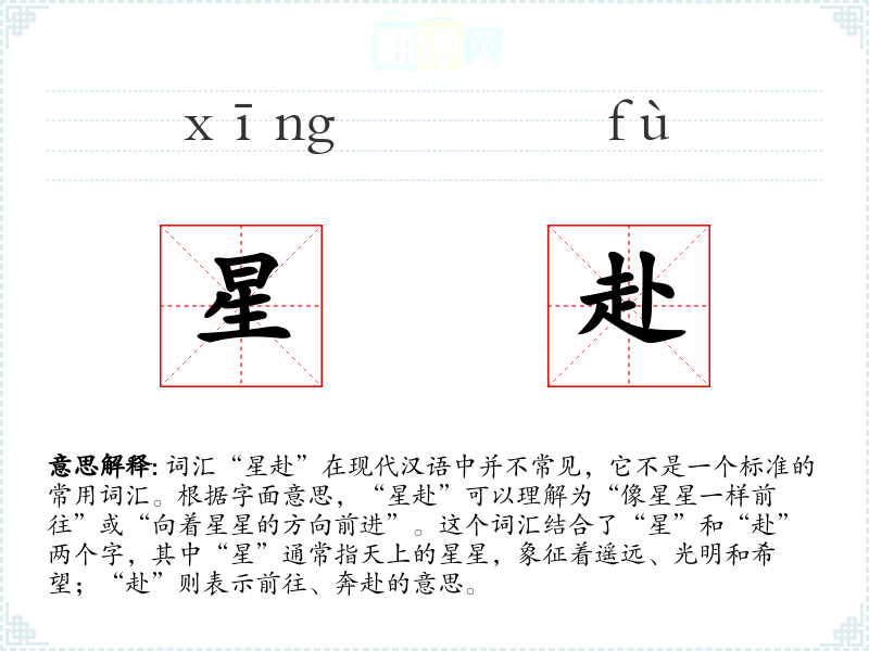 词汇“星赴”在现代汉语中并不常见,它不是一个标准的常用词汇。根据字面意思,“星赴”可以理解为“像星星一样前往”或“向着星星的方向前进”。这个词汇结合了“星”和“赴”两个字,其中“星”通常指天上的星星,象征着遥远、光明和希望;“赴”则表示前往、奔赴的意思。