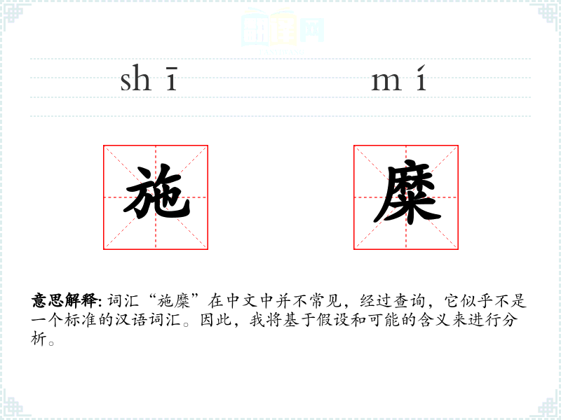 词汇“施糜”在中文中并不常见,经过查询,它似乎不是一个标准的汉语词汇。因此,我将基于假设和可能的含义来进行分析。