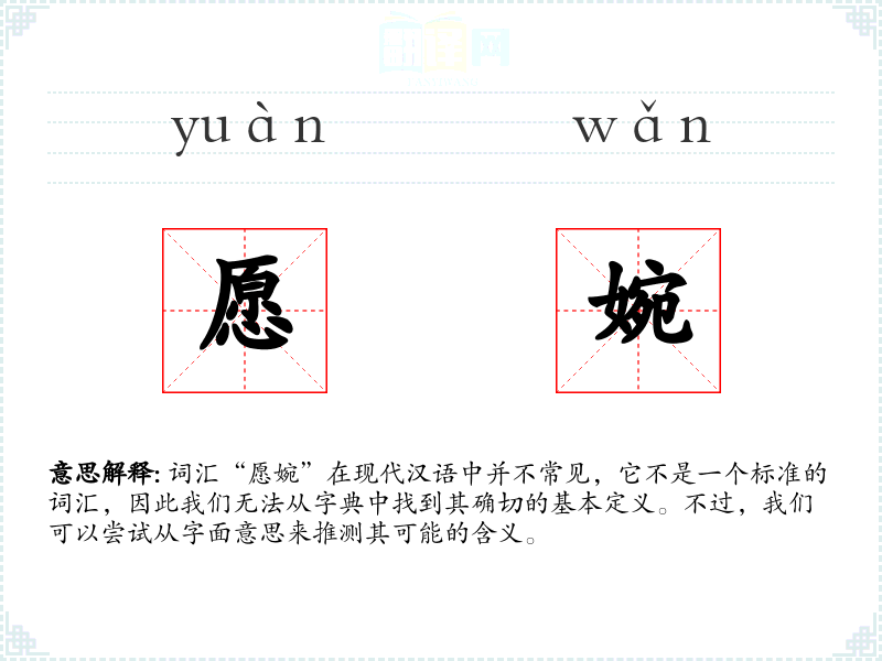 词汇“愿婉”在现代汉语中并不常见,它不是一个标准的词汇,因此我们无法从字典中找到其确切的基本定义。不过,我们可以尝试从字面意思来推测其可能的含义。
