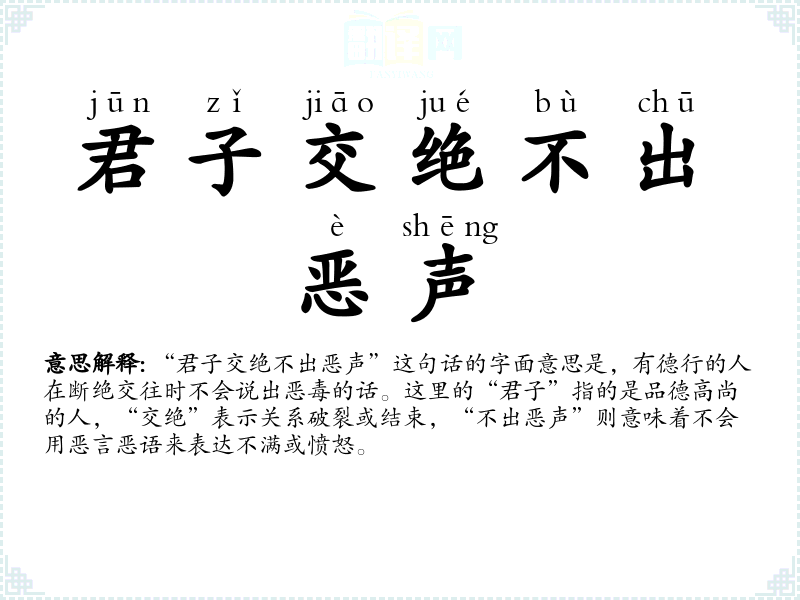 “君子交绝不出恶声”这句话的字面意思是,有德行的人在断绝交往时不会说出恶毒的话。这里的“君子”指的是品德高尚的人,“交绝”表示关系破裂或结束,“不出恶声”则意味着不会用恶言恶语来表达不满或愤怒。