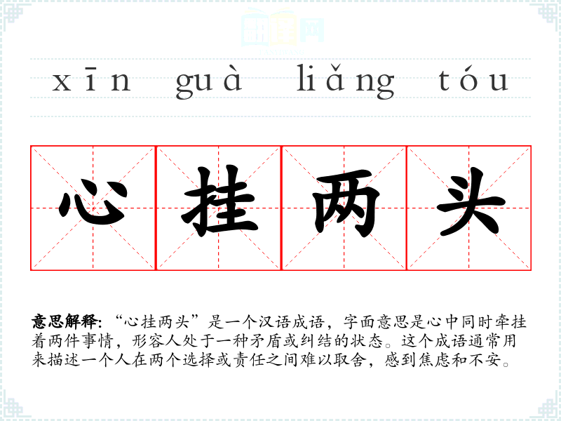 “心挂两头”是一个汉语成语,字面意思是心中同时牵挂着两件事情,形容人处于一种矛盾或纠结的状态。这个成语通常用来描述一个人在两个选择或责任之间难以取舍,感到焦虑和不安。