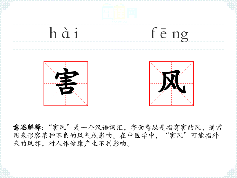 “害风”是一个汉语词汇,字面意思是指有害的风,通常用来形容某种不良的风气或影响。在中医学中,“害风”可能指外来的风邪,对人体健康产生不利影响。