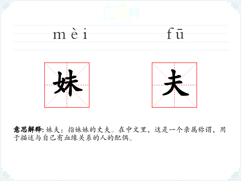 妹夫:指妹妹的丈夫。在中文里,这是一个亲属称谓,用于描述与自己有血缘关系的人的配偶。