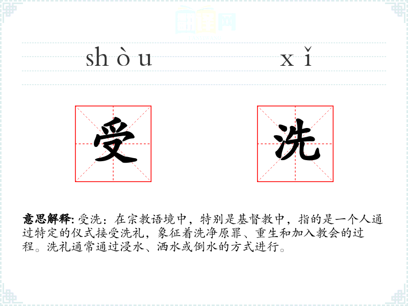 受洗:在语境中,特别是教中,指的是一个人通过特定的仪式接受洗礼,象征着洗净原罪、重生和加入教会的过程。洗礼通常通过浸水、洒水或倒水的方式进行。