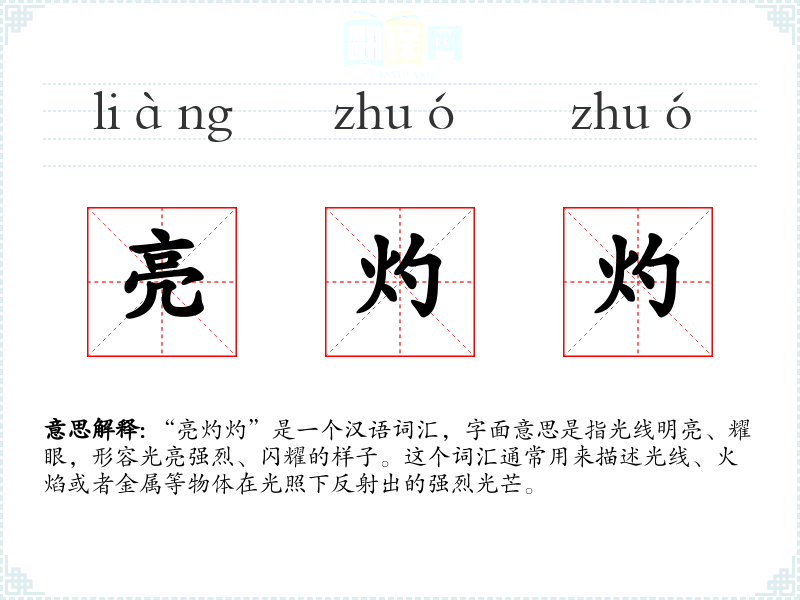 “亮灼灼”是一个汉语词汇,字面意思是指光线明亮、耀眼,形容光亮强烈、闪耀的样子。这个词汇通常用来描述光线、火焰或者金属等物体在光照下反射出的强烈光芒。