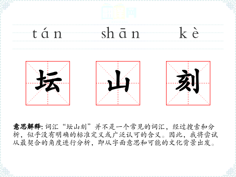 词汇“坛山刻”并不是一个常见的词汇,经过搜索和分析,似乎没有明确的标准定义或广泛认可的含义。因此,我将尝试从最契合的角度进行分析,即从字面意思和可能的文化背景出发。
