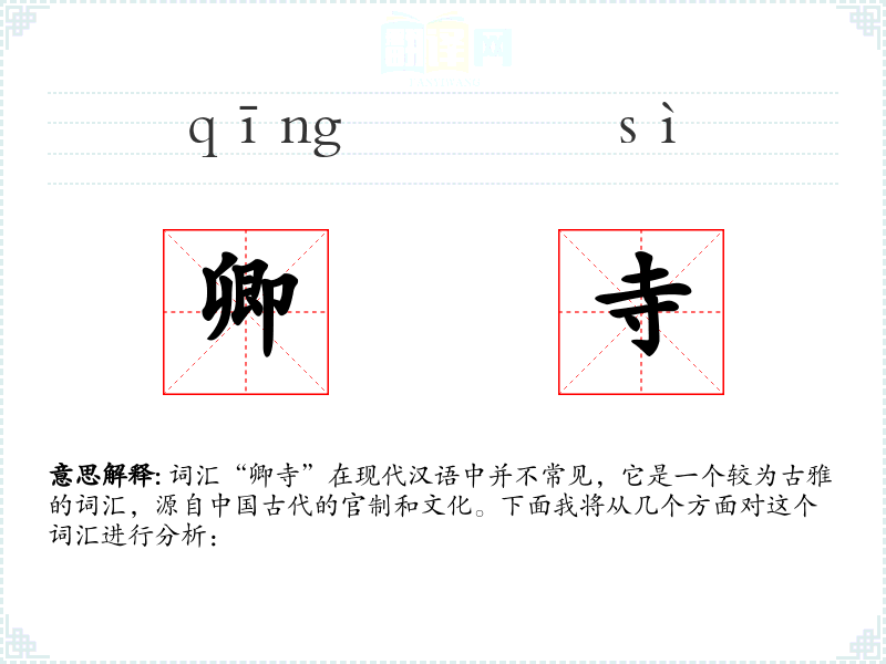 词汇“卿寺”在现代汉语中并不常见,它是一个较为古雅的词汇,源自**古代的官制和文化。下面我将从几个方面对这个词汇进行分析: