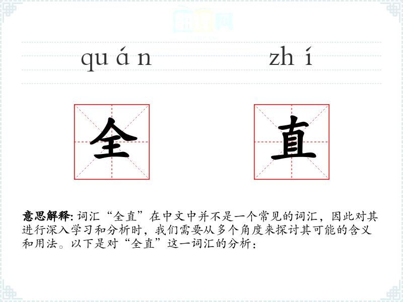 “全直”字面意思可能是指“完全直”或“全部直”,但在现代汉语中,这个词汇并不常见,可能需要结合具体语境来理解其确切含义。
