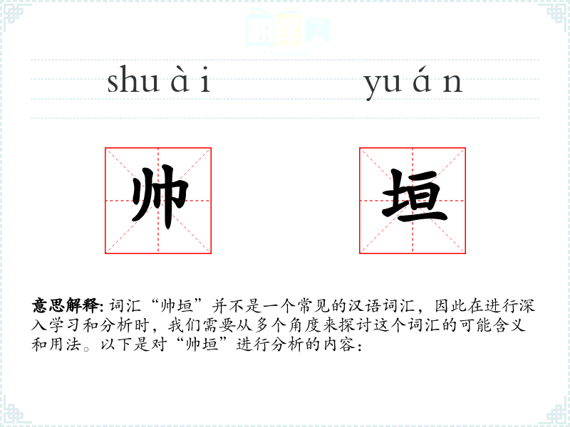 总的来说,“帅垣”这个词汇在现代汉语中并不常见,可能更多地出现在文学创作或特定语境中。对于语言学习和表达来说,了解这样的词汇可以增加语言的丰富性和创造性。