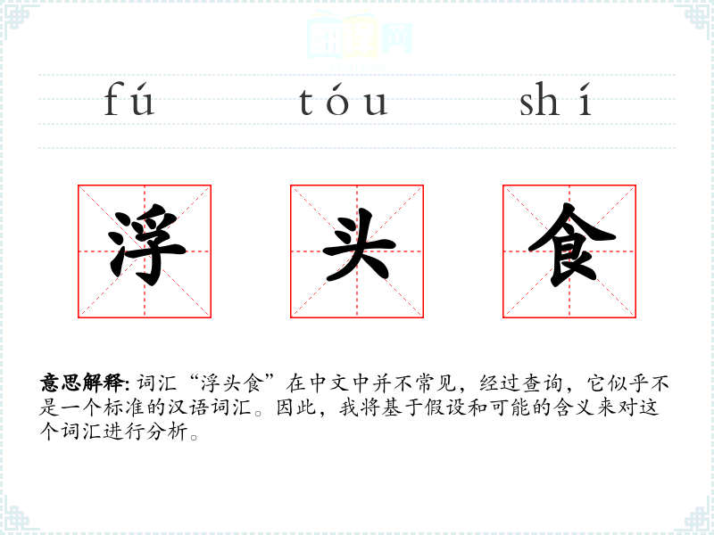 词汇“浮头食”在中文中并不常见,经过查询,它似乎不是一个标准的汉语词汇。因此,我将基于假设和可能的含义来对这个词汇进行分析。