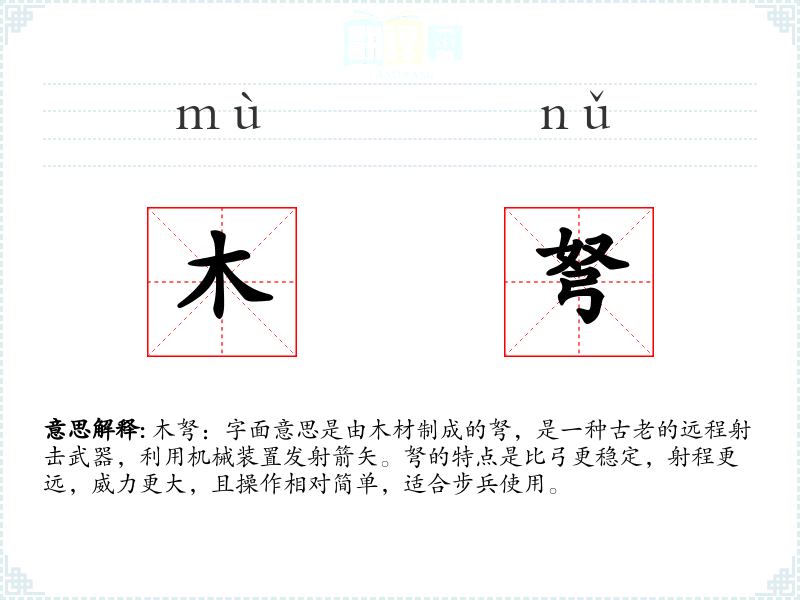 木弩的词源可以追溯到古代汉语,其中“木”指的是材料,“弩”是一种武器类型。随着时间的推移,木弩的制作技术有所发展,但其基本概念和用途保持不变。