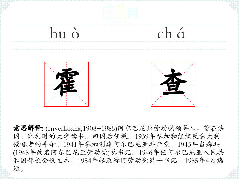 1.(enverhoxha,1908-1985)阿尔巴尼亚劳动党领导人。曾在法国、比利时的大学读书。回国后任教。1939年参加和组织反意大利侵略者的斗争。1941年参加创建阿尔巴尼亚共产党。1943年当癣共(1948年改名阿尔巴尼亚劳动党)总书记。1946年任阿尔巴尼亚人民共和国部长会议主席。1954年起改称阿劳动党第一书记。1985年4月病逝。