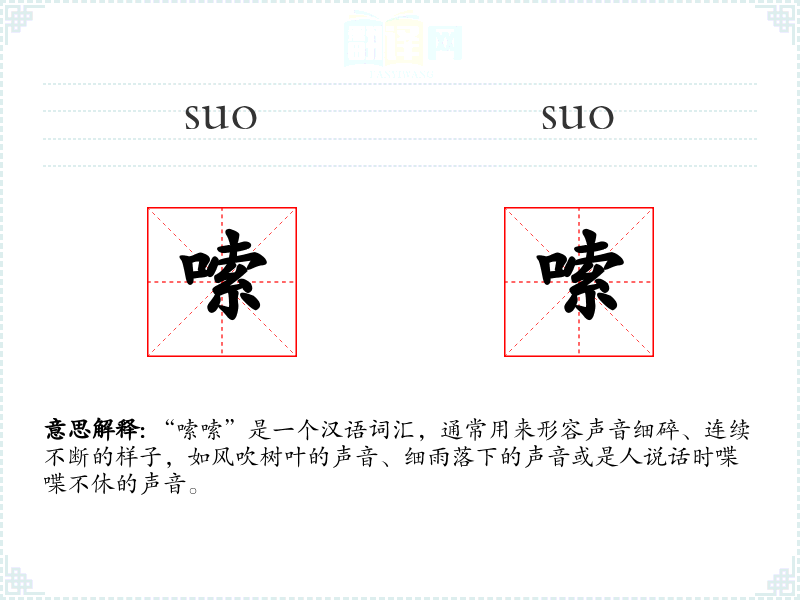 “嗦嗦”这个词在描述声音时非常形象,能够有效地传达出声音的细腻和连续性。在学*语言和表达时,掌握这样的词汇可以增强描述的生动性和准确性。