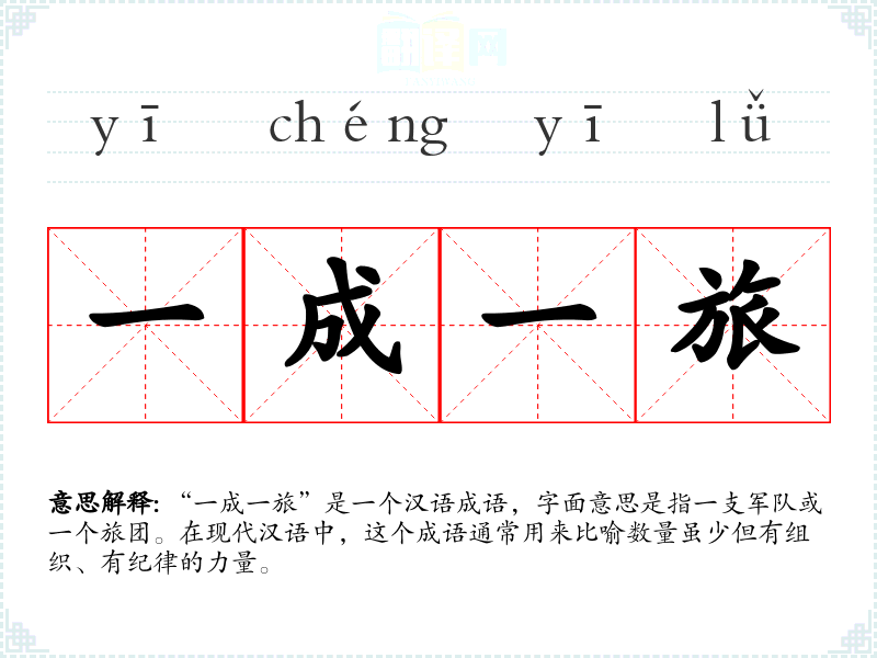 “一成一旅”是一个汉语成语,字面意思是指一支军队或一个旅团。在现代汉语中,这个成语通常用来比喻数量虽少但有组织、有纪律的力量。