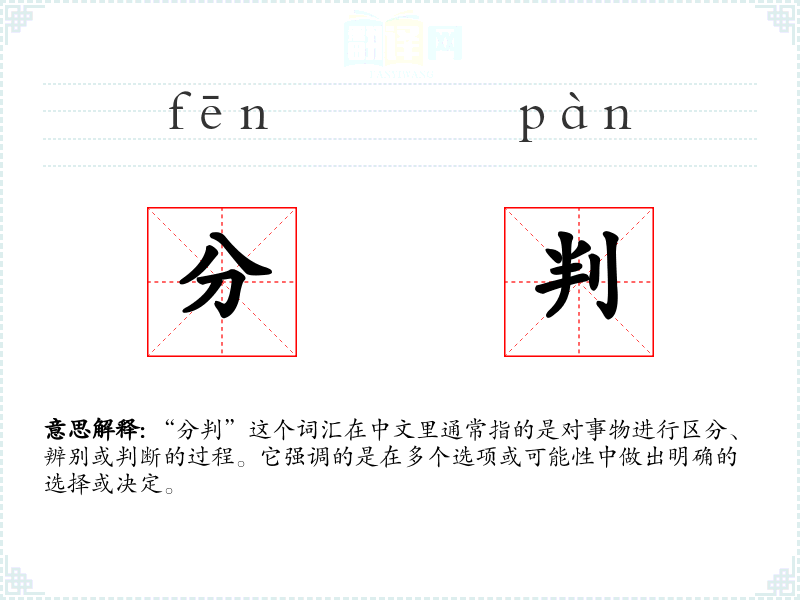 “分判”这个词汇在中文里通常指的是对事物进行区分、辨别或判断的过程。它强调的是在多个选项或可能性中做出明确的选择或决定。