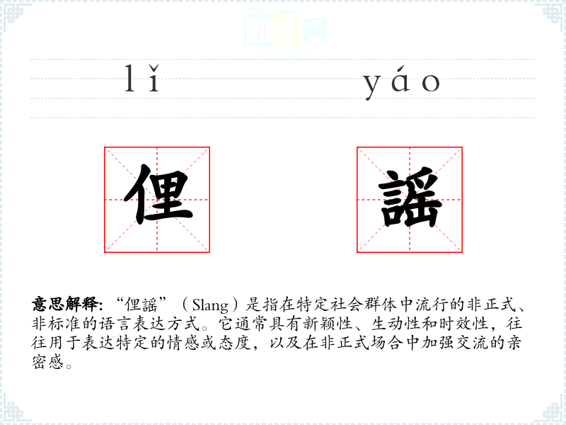 “俚謡”(Slang)是指在特定社会群体中流行的非正式、非标准的语言表达方式。它通常具有新颖性、生动性和时效性,往往用于表达特定的情感或态度,以及在非正式场合中加强交流的亲密感。