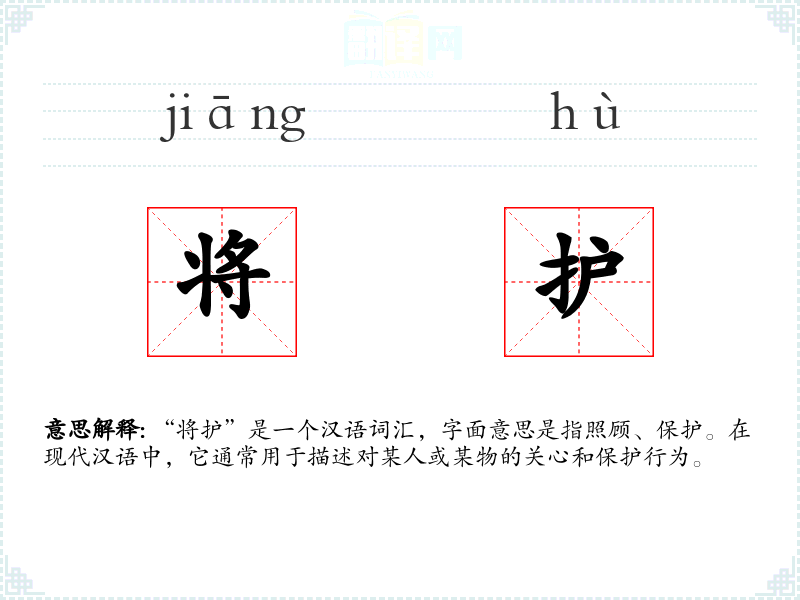 “将护”是一个汉语词汇,字面意思是指照顾、保护。在现代汉语中,它通常用于描述对某人或某物的关心和保护行为。