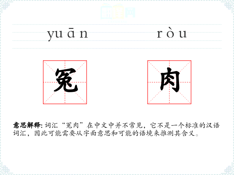 词汇“冤肉”在中文中并不常见,它不是一个标准的汉语词汇,因此可能需要从字面意思和可能的语境来推测其含义。