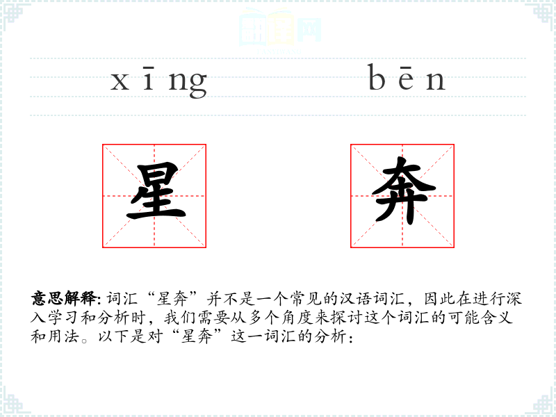 词汇“星奔”并不是一个常见的汉语词汇,因此在进行深入学*和分析时,我们需要从多个角度来探讨这个词汇的可能含义和用法。以下是对“星奔”这一词汇的分析: