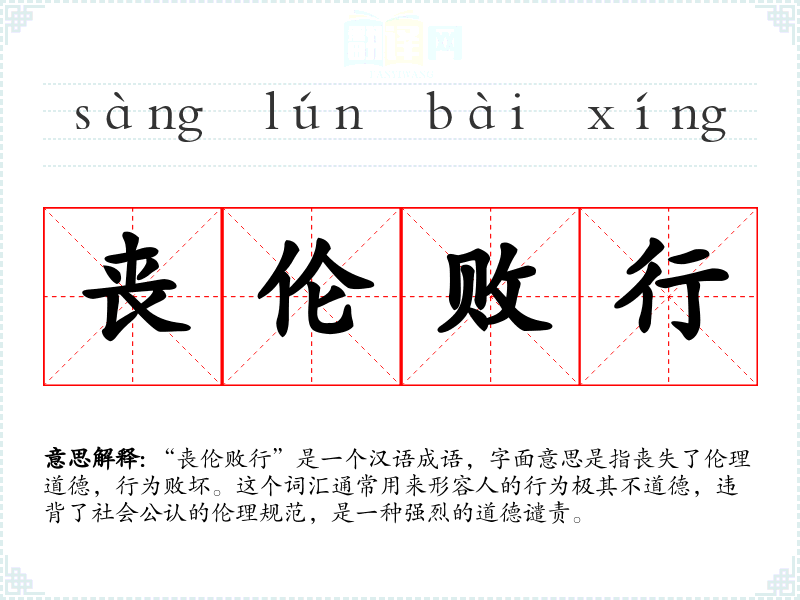 “丧伦败行”是一个汉语成语,字面意思是指丧失了伦理道德,行为败坏。这个词汇通常用来形容人的行为极其不道德,违背了社会公认的伦理规范,是一种强烈的道德谴责。