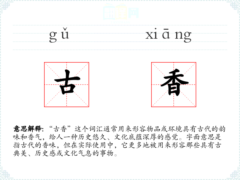 “古香”这个词汇通常用来形容物品或环境具有古代的韵味和香气,给人一种历史悠久、文化底蕴深厚的感觉。字面意思是指古代的香味,但在实际使用中,它更多地被用来形容那些具有古典美、历史感或文化气息的事物。