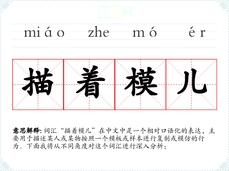 词汇“描着模儿”在中文中是一个相对口语化的表达,主要用于描述某人或某物按照一个模板或样本进行复制或模仿的行为。下面我将从不同角度对这个词汇进行深入分析: