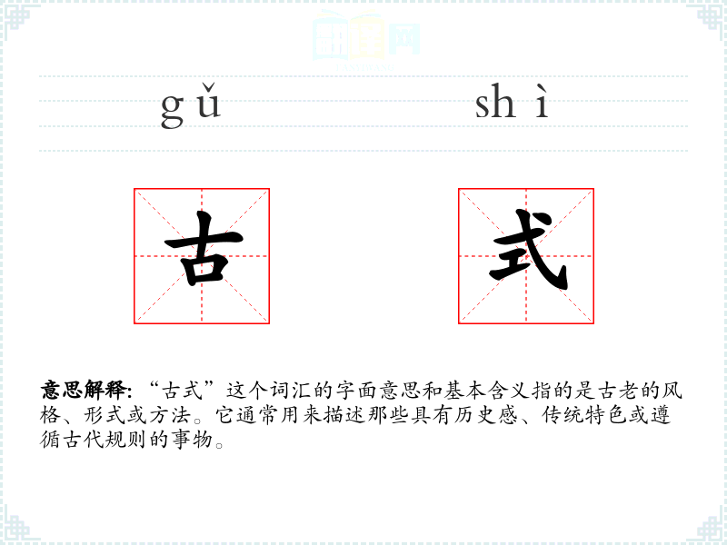 “古式”这个词汇的字面意思和基本含义指的是古老的风格、形式或方法。它通常用来描述那些具有历史感、传统特色或遵循古代规则的事物。