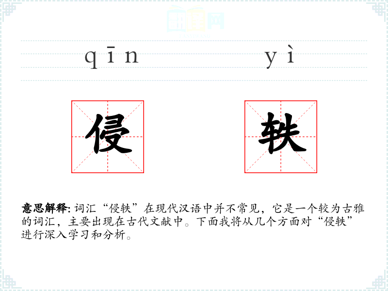 “侵轶”的字面意思是侵犯、越过界限。其中,“侵”指侵犯、侵入,“轶”指越过、超越。在古代文献中,常用来描述军队越过边界进行侵略的行为。