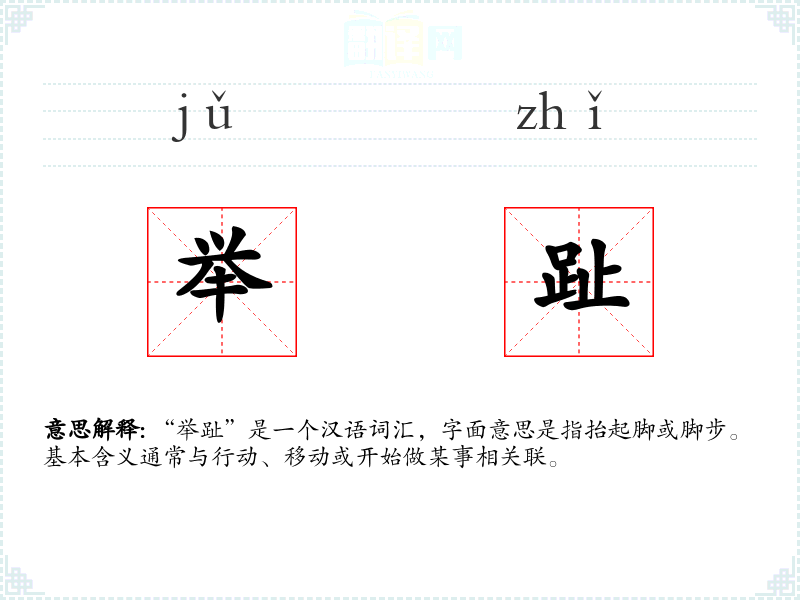 “举趾”是一个汉语词汇,字面意思是指抬起脚或脚步。基本含义通常与行动、移动或开始做某事相关联。