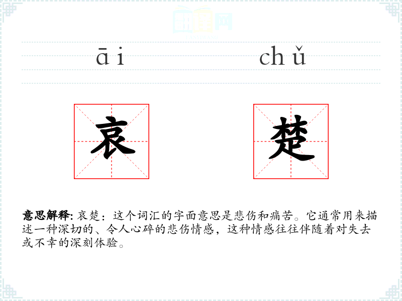 哀楚:这个词汇的字面意思是悲伤和痛苦。它通常用来描述一种深切的、令人心碎的悲伤情感,这种情感往往伴随着对失去或不幸的深刻体验。
