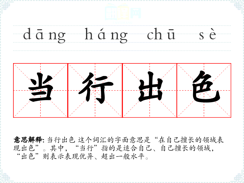 当行出色 这个词汇的字面意思是“在自己擅长的领域表现出色”。其中,“当行”指的是适合自己、自己擅长的领域,“出色”则表示表现优异、超出一般水平。