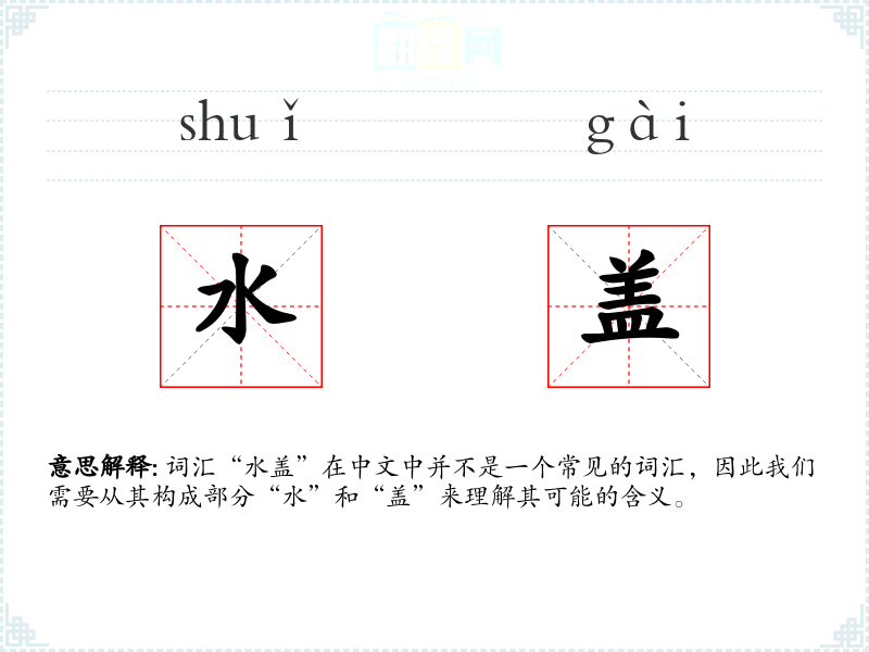 词汇“水盖”在中文中并不是一个常见的词汇,因此我们需要从其构成部分“水”和“盖”来理解其可能的含义。