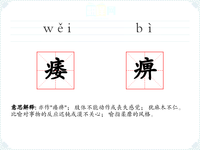 亦作"痿痹"; 肢体不能动作或丧失感觉; 犹