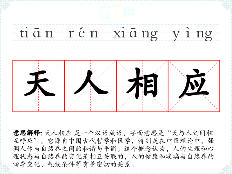 天人相应 是一个汉语成语,字面意思是“天与人之间相互呼应”。它源自**古代哲学和医学,特别是在中医理论中,强调人体与自然界之间的和谐与平衡。这个概念认为,人的生理和心理状态与自然界的变化是相互关联的,人的健康和疾病与自然界的四季变化、气候条件等有着密切的关系。