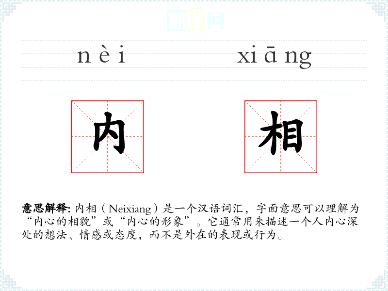 内相(Neixiang)是一个汉语词汇,字面意思可以理解为“内心的相貌”或“内心的形象”。它通常用来描述一个人内心深处的想法、情感或态度,而不是外在的表现或行为。