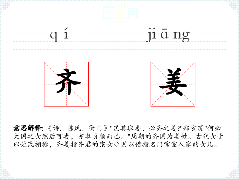 《诗.陈风.衡门》"岂其取妻,必齐之姜?"郑玄笺"何必大国之女然后可妻,亦取贞顺而已。"周朝的齐国为姜姓。古代女子以姓氏相称,齐姜指齐君的宗女◇因以借指名门官宦人家的女儿。