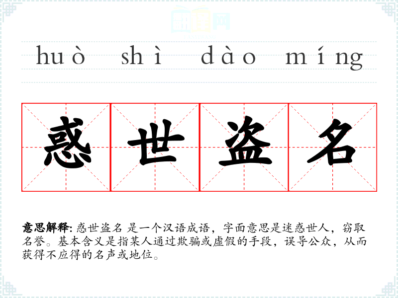 在英语中,类似的表达可能是 "deceive the public for fame" 或 "gain reputation through deceit",虽然不如惑世盗名 这个成语简洁有力,但传达的意思相似。