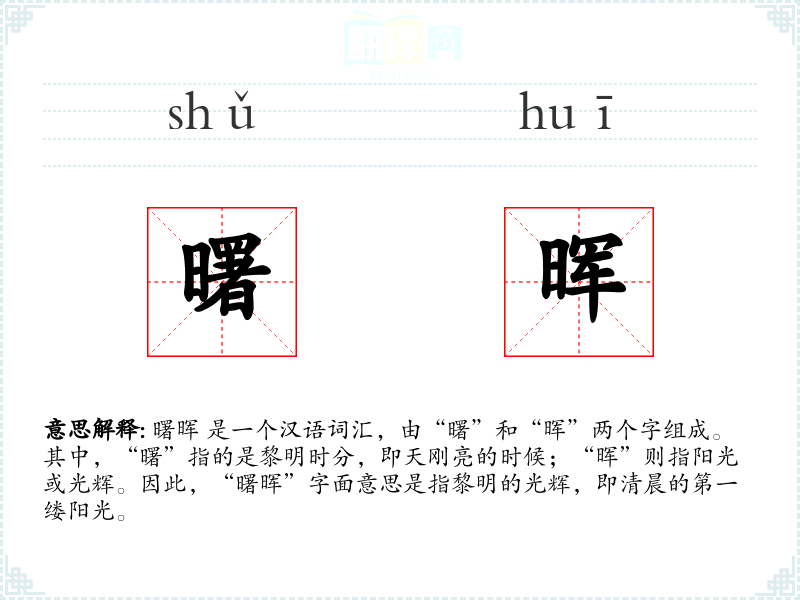 “曙”字最早见于《说文解字》,意为天刚亮;“晖”字则来源于“辉”,意为光辉。两个字结合形成“曙晖”,在古代文献中已有使用,如《诗经》中就有“曙光”的表述。
