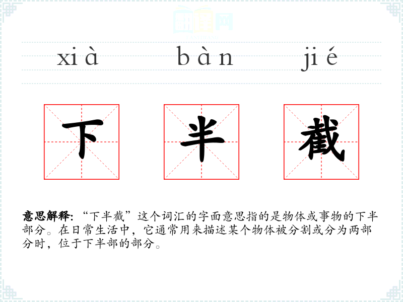 “下半截”这个词汇在中文中的使用历史悠久,其结构简单明了,由“下半”和“截”两个部分组成,直接表达了其含义。随着语言的发展,这个词汇的使用逐渐固定,成为描述物体下半部分的常用词汇。