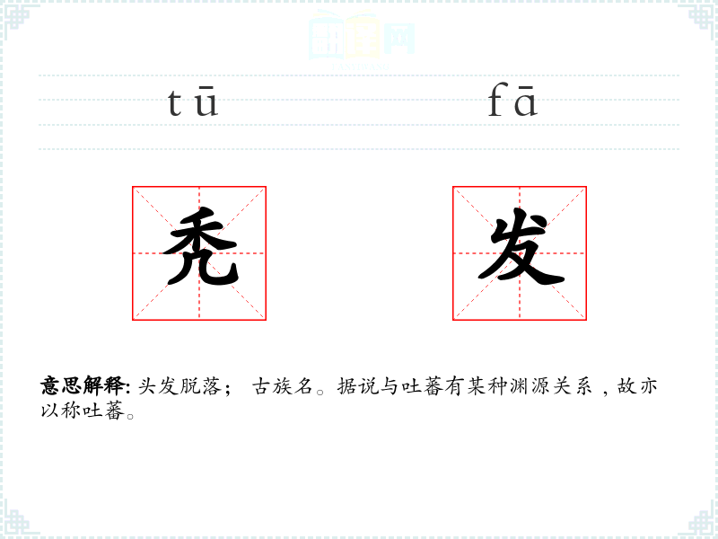 头发脱落; 古族名。据说与吐蕃有某种渊源关系﹐故亦以称吐蕃。