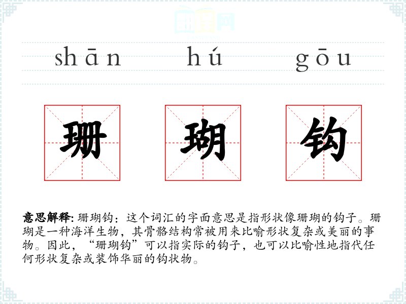 珊瑚钩:这个词汇的字面意思是指形状像珊瑚的钩子。珊瑚是一种海洋生物,其骨骼结构常被用来比喻形状复杂或美丽的事物。因此,“珊瑚钩”可以指实际的钩子,也可以比喻性地指代任何形状复杂或装饰华丽的钩状物。