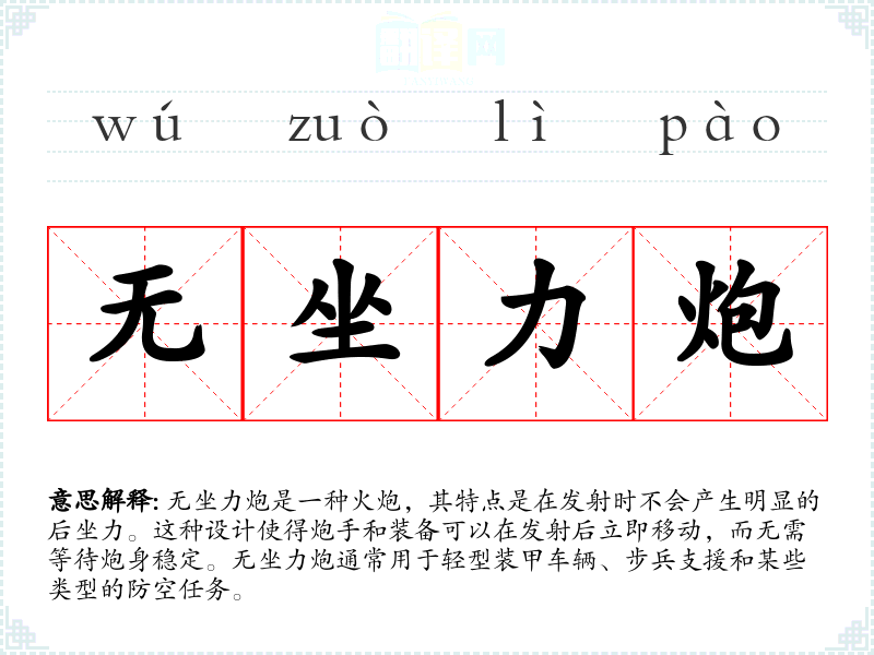 同义词:反冲炮、后坐力消除炮 反义词:传统火炮(指那些发射时会产生明显后坐力的火炮)