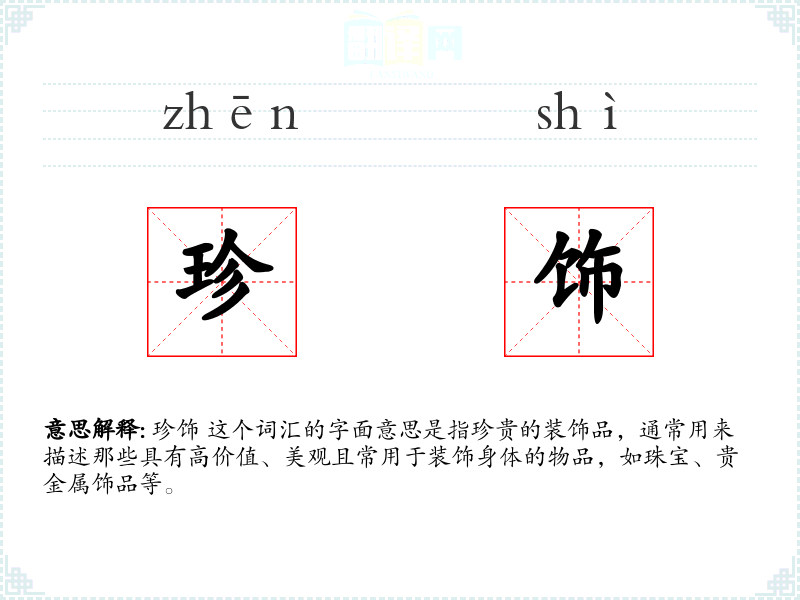 珍饰 这个词汇的字面意思是指珍贵的装饰品,通常用来描述那些具有高价值、美观且常用于装饰身体的物品,如珠宝、贵金属饰品等。