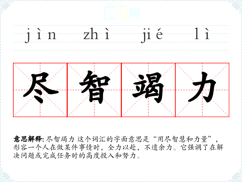尽智竭力 这个词汇的字面意思是“用尽智慧和力量”,形容一个人在做某件事情时,全力以赴,不遗余力。它强调了在解决问题或完成任务时的高度投入和努力。
